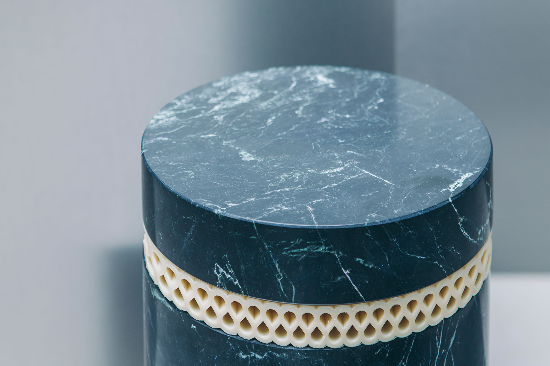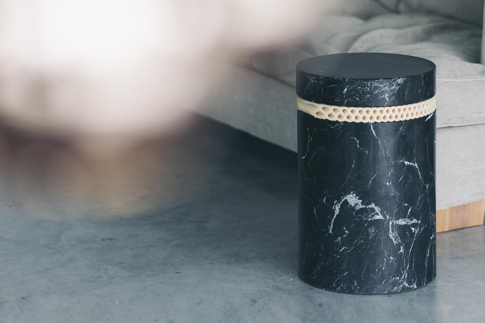 brut, a seating object that takes on the challenge to bring active sitting and aesthetics together. brut combines massive marble with a self-developed flexible part which makes it possible to sit more dynamically. By using a part made of rubber, the top of the object becomes movable when one sits on it. This solution not only makes sitting more enjoyable but offers improved ergonomics as well.