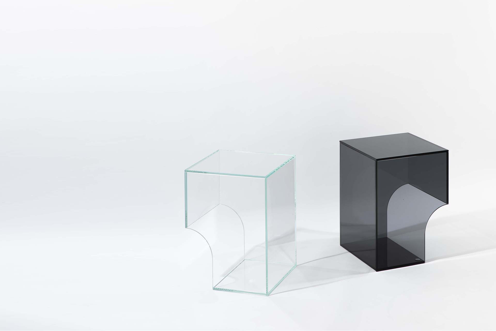 barh’s arch also comes in a glass version. A side table with a clear design language. The transparent object shows interesting views along each side. The different layers give depth to the object.