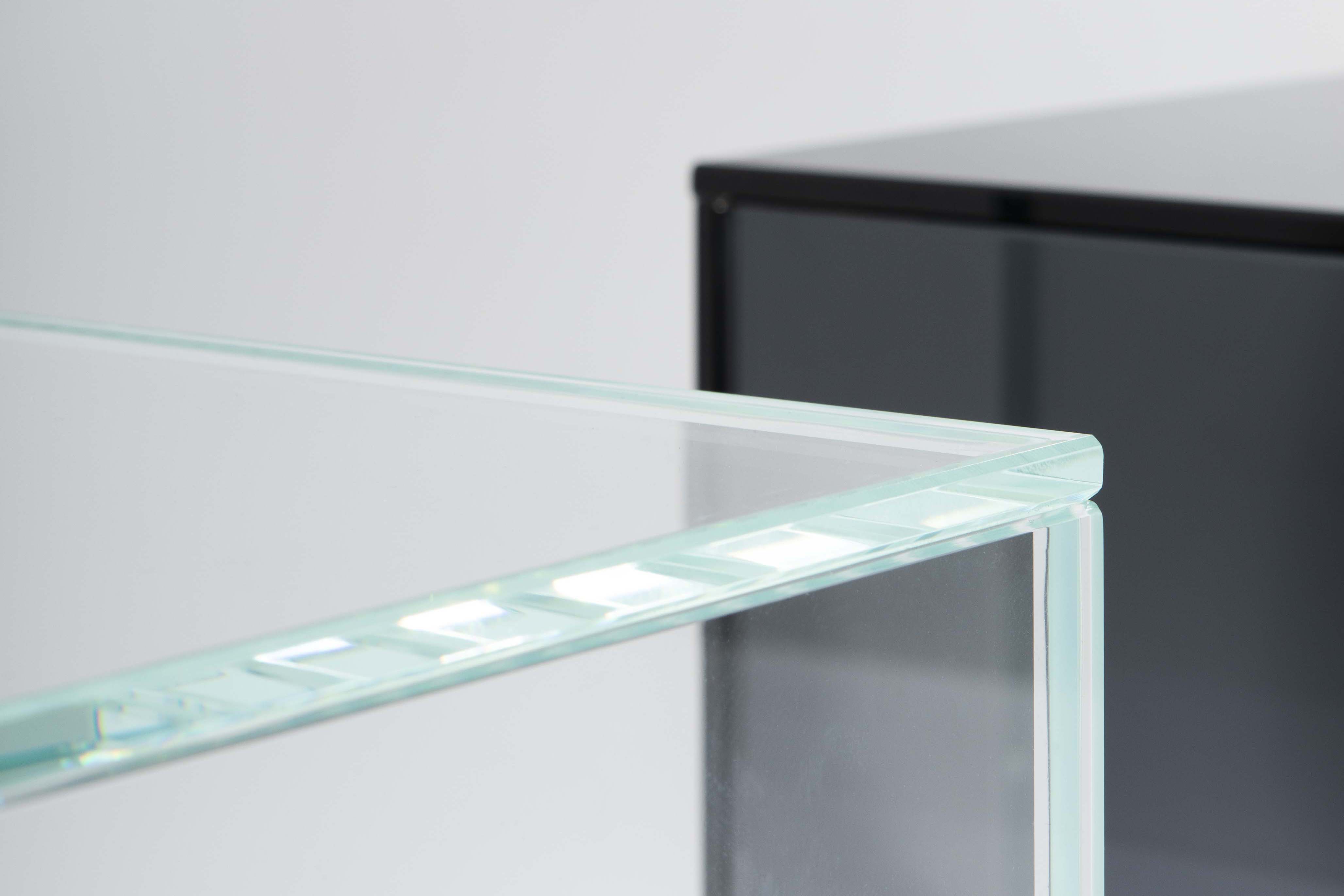 The glass version is made of hardened float glass panels and is available in different colors. Extra clear, green, blue, bronze and grey.